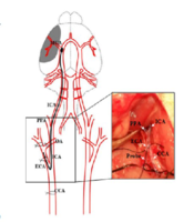 MCAO是middle cerebral artery occlusion 的缩写形式,中文意思为中脑动脉栓塞。大脑中动脉栓塞模型并不是把线栓插进大脑中动脉,而是经颈内动脉入颅并插入大脑前动脉,从而阻塞来自栓塞侧的大脑前动脉的血供,以及堵塞接受后交通动脉血供的的颈内动脉颅内段。
