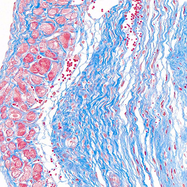 丽春红酸性品红-苯胺蓝染色,是用于检测动物组织中胶原纤维的一种染色方法之一,能够将胶原纤维染成蓝色,肌纤维、和红细胞呈红色,可用于鉴胶原纤维和肌纤维;并显示各种组织胶原纤维含量及纤维化程度。